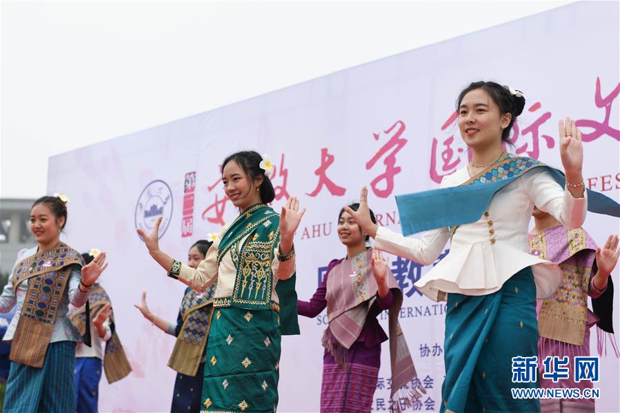 11月17日,來自老撾的留學(xué)生在國際文化節(jié)上表演舞蹈。新華社記者 張端 攝