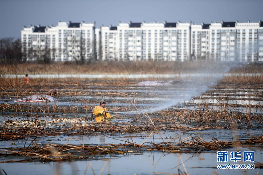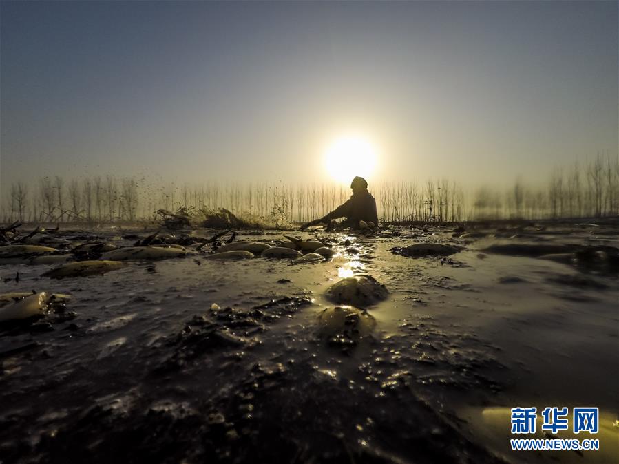 11月18日,工人在采收蓮藕。初冬時(shí)節(jié),河北省唐山市曹妃甸蓮藕豐收,工人們?cè)诮Y(jié)冰之前忙著采收蓮藕。新華社記者楊世堯攝