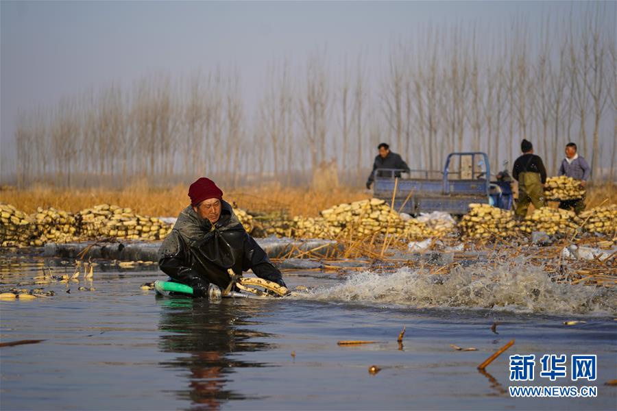 11月18日,工人在采收蓮藕。初冬時(shí)節(jié),河北省唐山市曹妃甸蓮藕豐收,工人們?cè)诮Y(jié)冰之前忙著采收蓮藕。新華社記者邢廣利攝