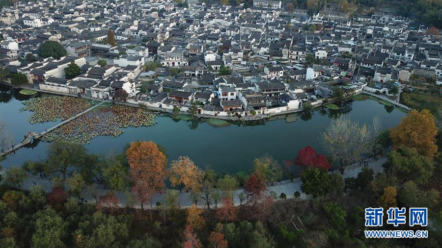 這是11月15日無人機(jī)拍攝的宏村風(fēng)景區(qū)晨景。新華社記者韓曉雨攝