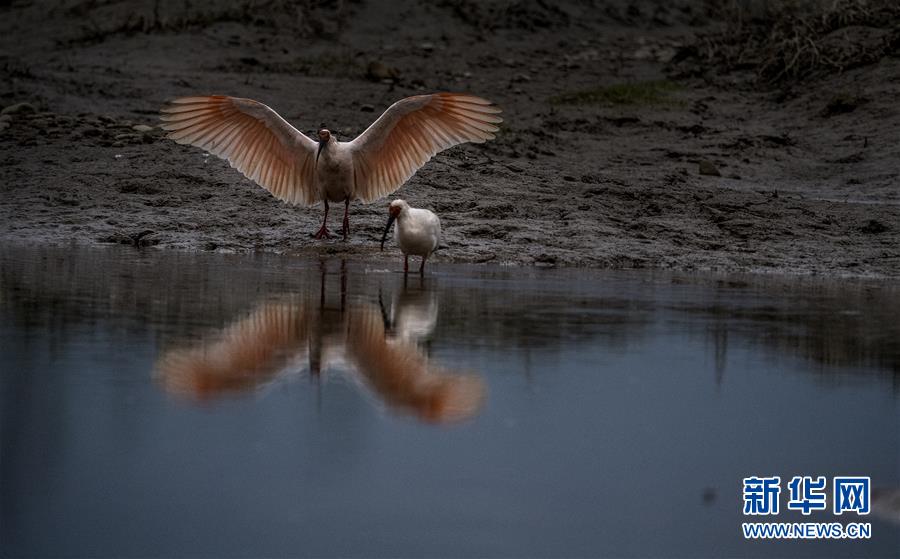11月19日,朱鹮在漢江支流的牧馬河畔覓食。 新華社記者陶明攝