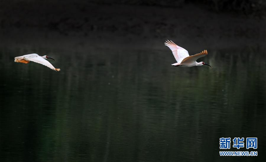 11月19日,朱鹮飛翔在陜西省漢中市西鄉(xiāng)縣峽口鎮(zhèn)牧馬河上空。 新華社記者陶明攝