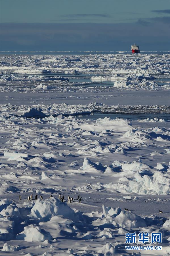 從“雪龍2”號上拍攝的企鵝群和“雪龍”號(11月19日攝)。新華社記者劉詩平攝