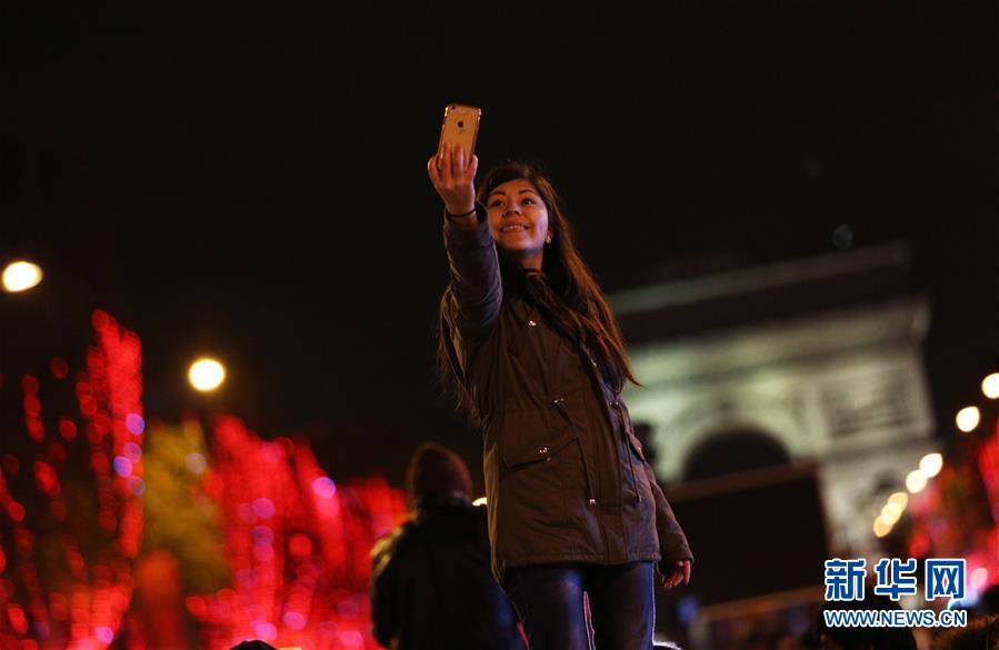 11月24日,在法國巴黎,一名女子在香榭麗舍大街點燈儀式上留影。當日,法國巴黎香榭麗舍大街點亮彩燈迎圣誕。從即日起至1月8日,整條香榭麗舍大街都將被喜慶的節(jié)日燈飾點亮。新華社記者高靜攝