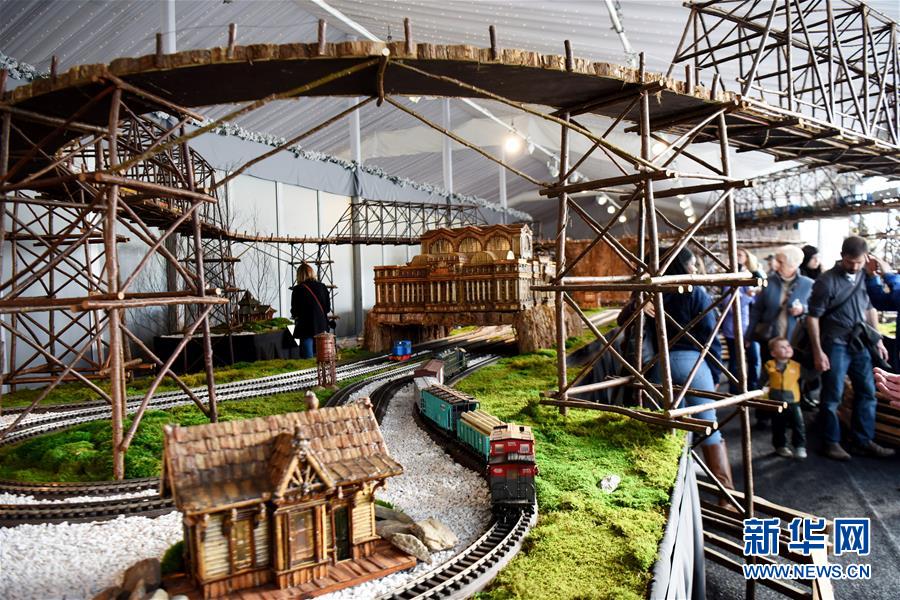 11月26日,在美國紐約植物園節(jié)日小火車展上,模型小火車駛出紐約中央車站微縮模型。新華社記者韓芳攝