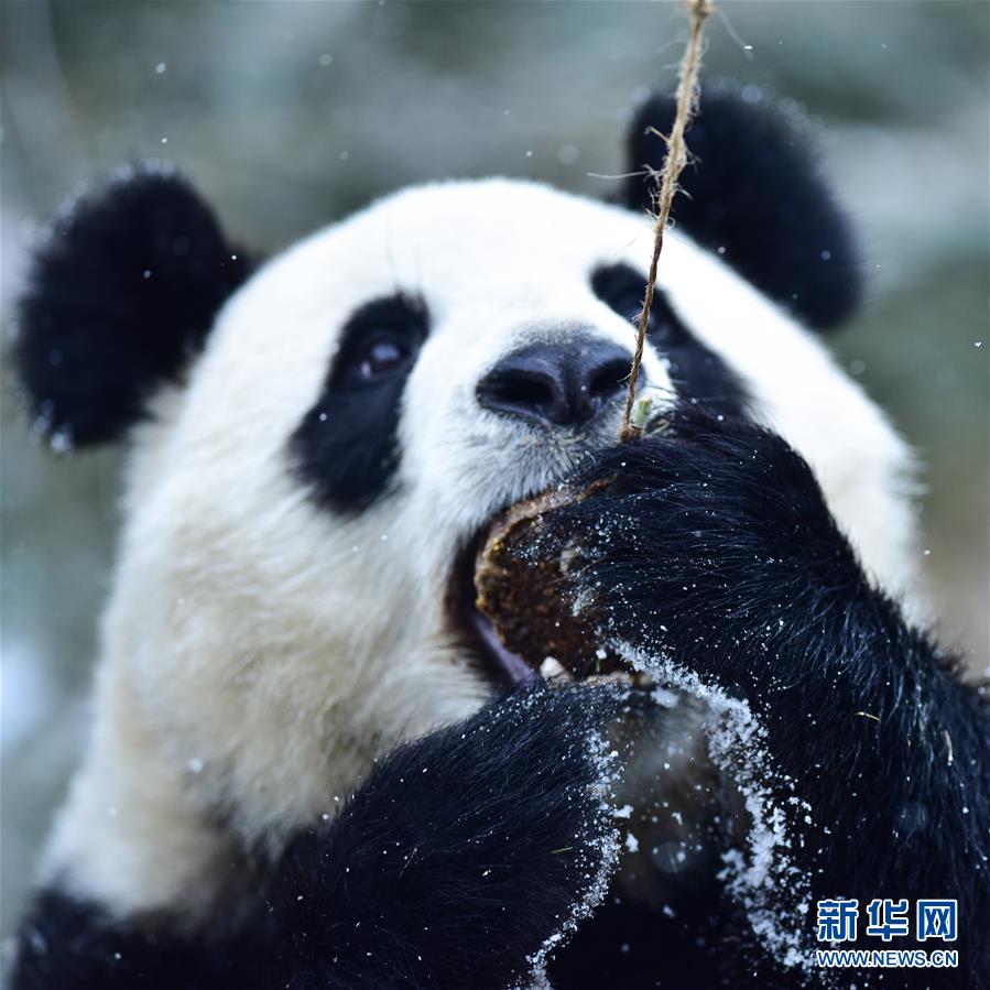 11月29日,在西寧熊貓館內,一只大熊貓在吃飼養(yǎng)員投送的食物。 新華社記者 吳剛 攝