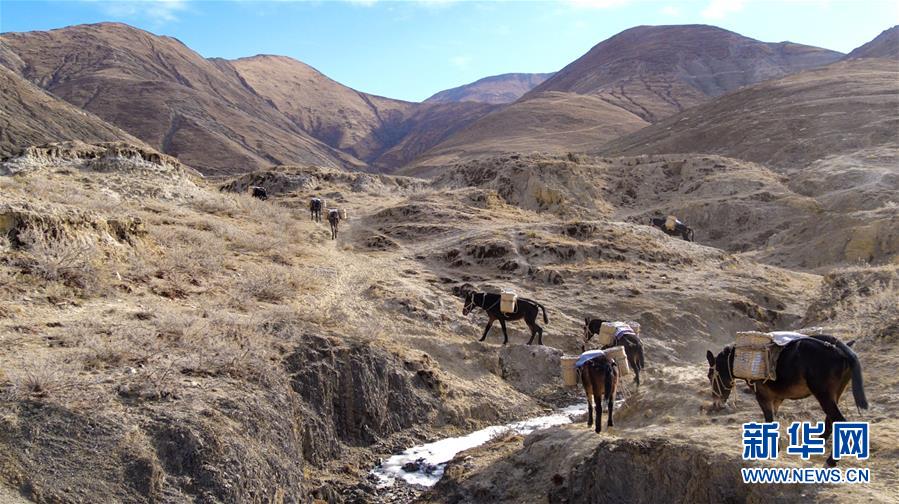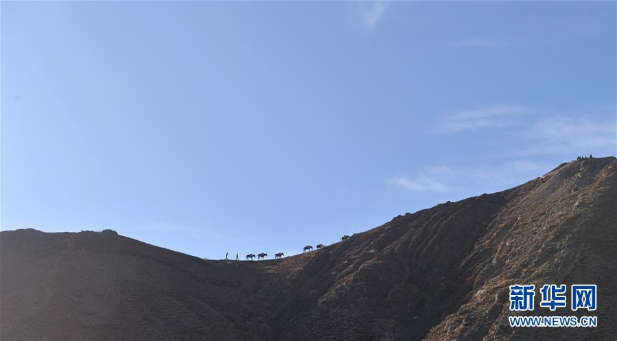 12月6日,騾馬隊馱負(fù)工程物料前往山頂塔基施工現(xiàn)場。新華社記者侯捷攝