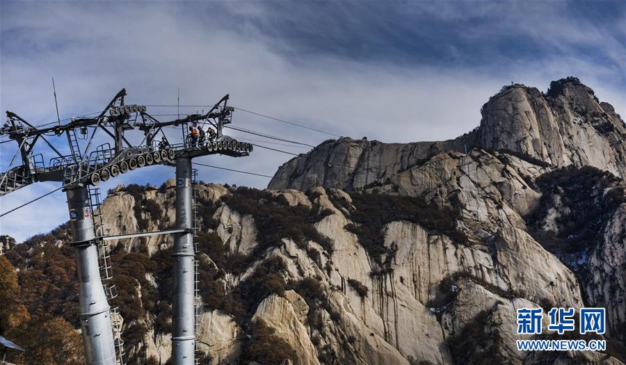 華山太華索道維修人員對索道支架及鋼絲繩進(jìn)行檢測(12月6日攝)。新華社記者陶明攝