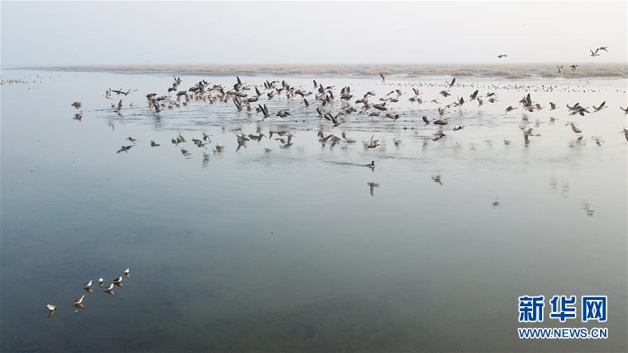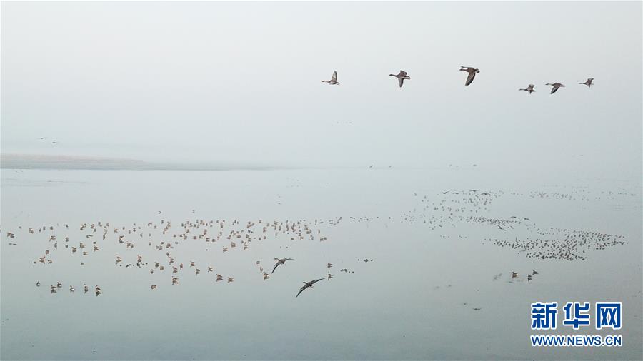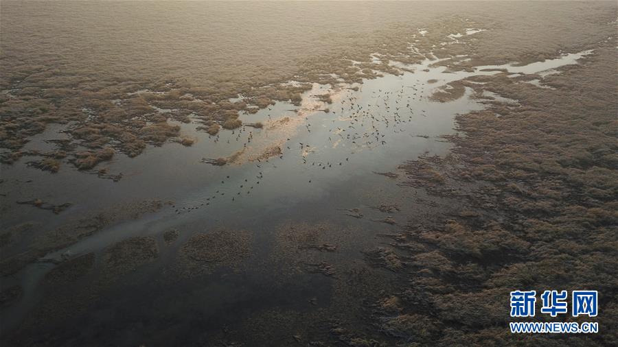 12月7日,一群候鳥在升金湖停留(無人機(jī)拍攝)。新華社記者張端攝