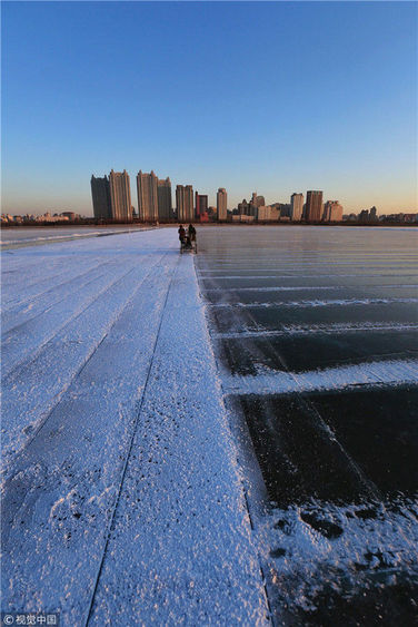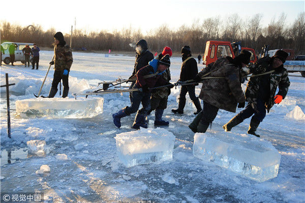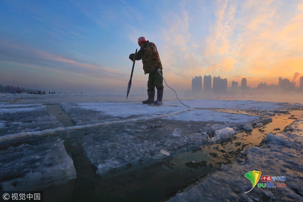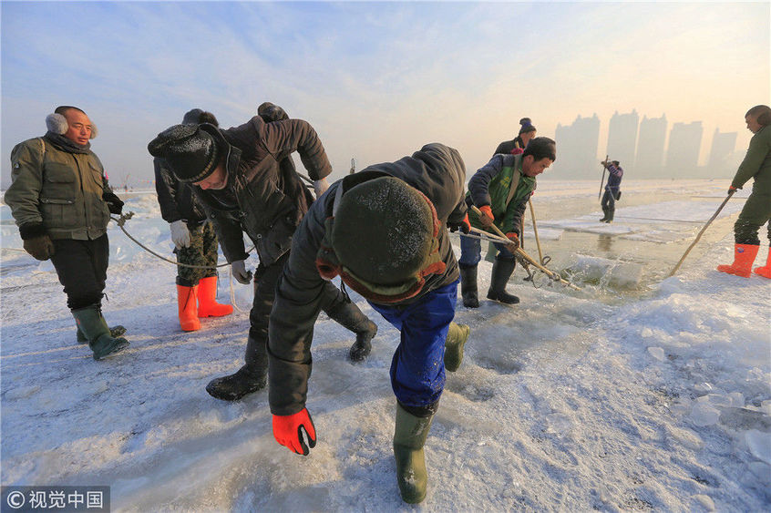 2018年12月8日,最低氣溫零下22度,哈爾濱市江北公路大橋東側(cè)的江面上,工人們正在從江中撈取冰塊,裝車運(yùn)往景區(qū)制作冰燈、冰雕?,F(xiàn)場,工人先是用電鋸、鐵釬將冰分割成半米多寬,一米多長的冰塊,接著將其拉出水面。等候在旁的叉車上前,將冰裝上運(yùn)冰的卡車,之后裝滿冰塊的卡車駛往景區(qū)。