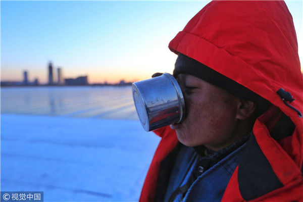 2018年12月11日,黑龍江省哈爾濱市,松花江上,采冰者們彎腰拉繩,宛如纖夫般拽重達(dá)半噸的冰塊出水。采冰者都是自哈市江北萬寶、東發(fā)、沙陀子等鄉(xiāng)鎮(zhèn)的農(nóng)民,他們每年冬閑時(shí)都會(huì)親屬、村鄰之間結(jié)伴到松花江畔采冰,有的采冰人,已經(jīng)連續(xù)干了二十多年。每個(gè)采冰季,他們每天要在冰面上工作10-12個(gè)小時(shí),每個(gè)采冰組,一天要拽出冰塊2000-3000塊,一個(gè)近20天的采冰季,每人能收入近萬元。