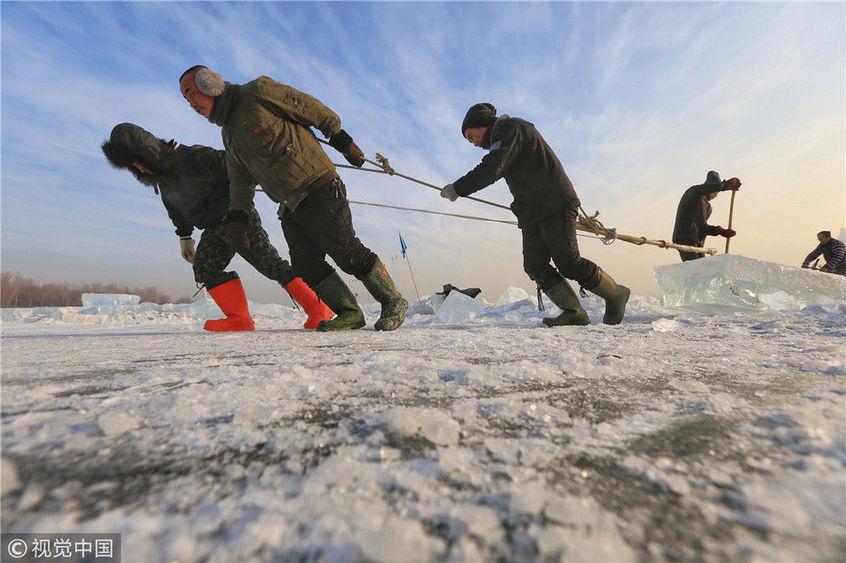 2018年12月11日,黑龍江省哈爾濱市,松花江上,采冰者們彎腰拉繩,宛如纖夫般拽重達(dá)半噸的冰塊出水。采冰者都是自哈市江北萬寶、東發(fā)、沙陀子等鄉(xiāng)鎮(zhèn)的農(nóng)民,他們每年冬閑時(shí)都會(huì)親屬、村鄰之間結(jié)伴到松花江畔采冰,有的采冰人,已經(jīng)連續(xù)干了二十多年。每個(gè)采冰季,他們每天要在冰面上工作10-12個(gè)小時(shí),每個(gè)采冰組,一天要拽出冰塊2000-3000塊,一個(gè)近20天的采冰季,每人能收入近萬元。視覺中國