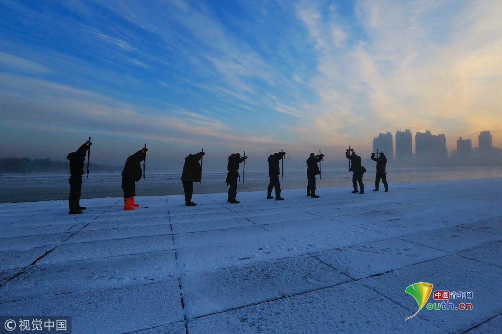 中國青年網(wǎng)2018年12月13日訊2018年12月11日,黑龍江省哈爾濱市,松花江上,采冰人在漫天霞光中破冰、采冰,金色光芒在水霧上升騰繚繞,給勞動(dòng)的場面增添了詩意。