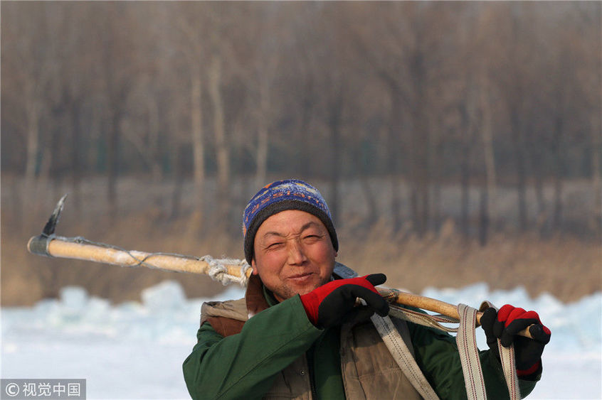 2018年12月11日,黑龍江省哈爾濱市,松花江上,采冰者們彎腰拉繩,宛如纖夫般拽重達半噸的冰塊出水。采冰者都是自哈市江北萬寶、東發(fā)、沙陀子等鄉(xiāng)鎮(zhèn)的農(nóng)民,他們每年冬閑時都會親屬、村鄰之間結(jié)伴到松花江畔采冰,有的采冰人,已經(jīng)連續(xù)干了二十多年。每個采冰季,他們每天要在冰面上工作10-12個小時,每個采冰組,一天要拽出冰塊2000-3000塊,一個近20天的采冰季,每人能收入近萬元。