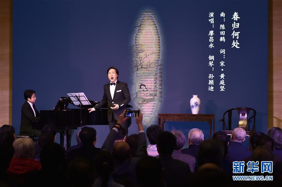 12月10日晚,廖昌永在音樂會上演唱《春歸何處》。 當晚,中國古典詩詞與書畫——廖昌永中國藝術(shù)歌曲獨唱音樂會在北京中國美術(shù)館舉行。 新華社記者 魯鵬 攝