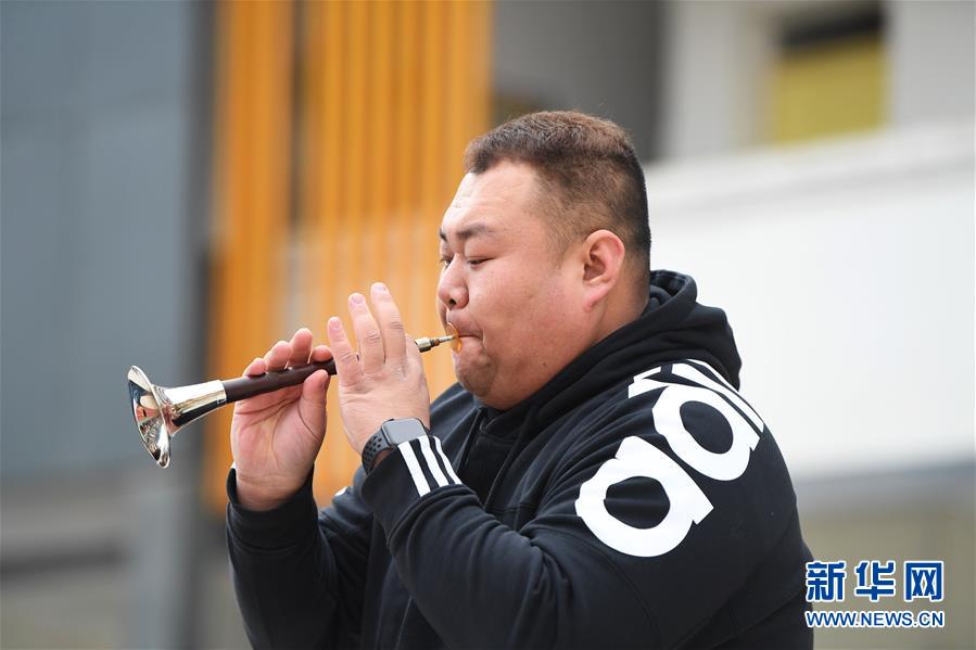 12月12日,文藝志愿者在中益鄉(xiāng)小學(xué)演奏嗩吶。新華社記者 王全超 攝