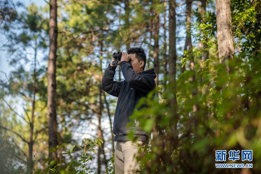 羅康在哀牢山的松樹(shù)林里觀測(cè)鳥(niǎo)類(lèi)(12月12日攝)。 新華社記者 胡超 攝