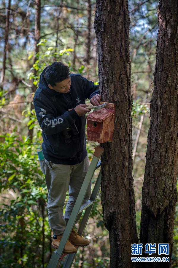 羅康在哀牢山的松樹(shù)林里安裝人工鳥(niǎo)巢(12月12日攝)。 新華社記者 胡超 攝
