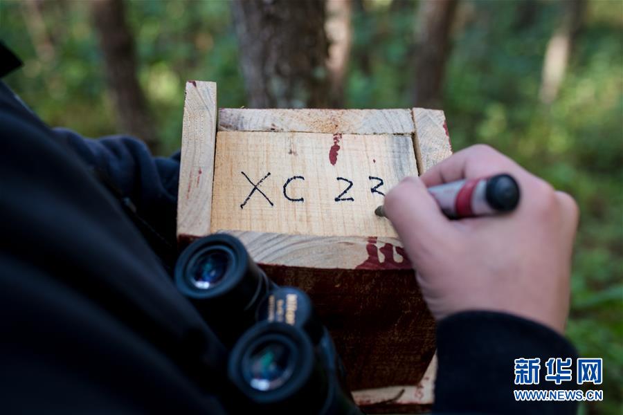 羅康在新做好的人工鳥(niǎo)巢底部寫(xiě)下編號(hào)(12月12日攝)。 新華社記者 胡超 攝