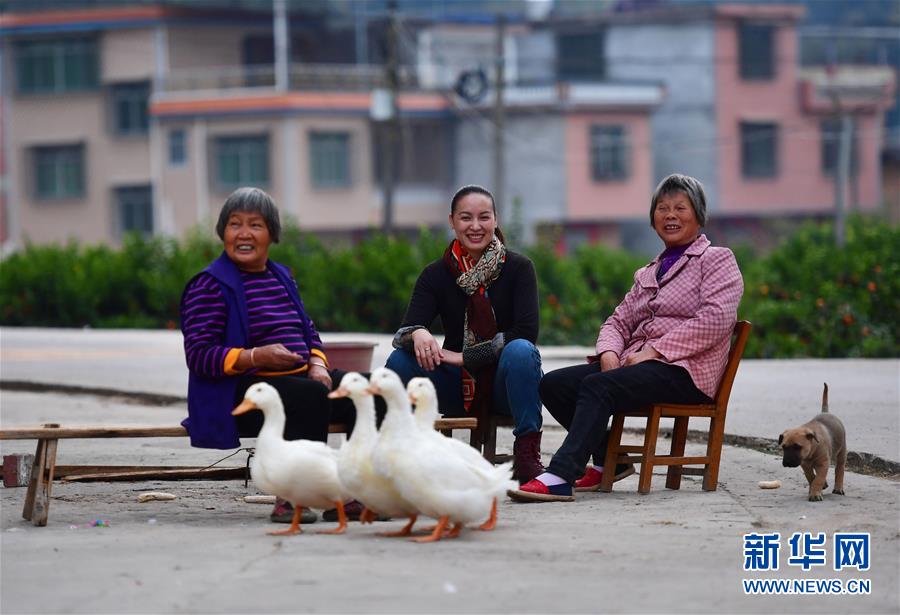 在鹿寨縣拉溝鄉(xiāng)木龍村,李柳萍(右二)在回村采購土特產途中和老人們交流(12月14日攝)。新華社記者黃孝邦攝