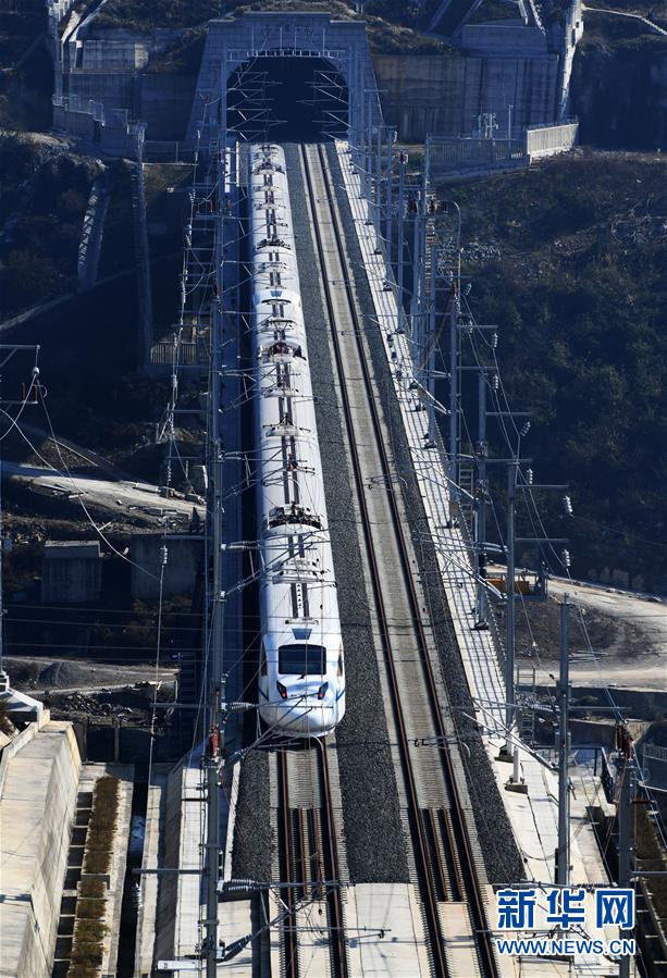 12月15日,一列試驗列車行駛在貴州清鎮(zhèn)市境內(nèi)的成貴高鐵線上。成(都)貴(陽)高鐵預計于12月16日全線正式開通運營。成貴高鐵線路全長650公里,是我國“八縱八橫”高速鐵路網(wǎng)的重要組成部分,設計時速為250公里。新華社記者楊文斌攝