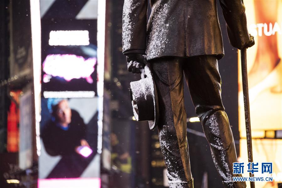 12月18日,美國(guó)紐約時(shí)報(bào)廣場(chǎng)上的雕像落上積雪。新華社記者 王迎 攝
