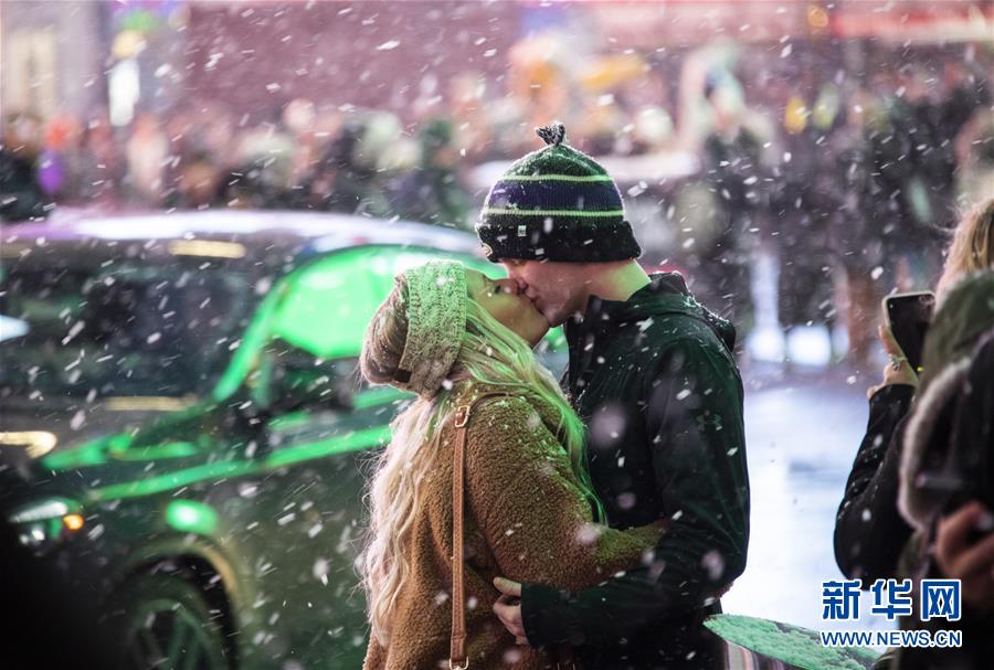 12月18日,在美國紐約時(shí)報(bào)廣場,一對情侶在雪中擁吻。新華社記者 王迎 攝