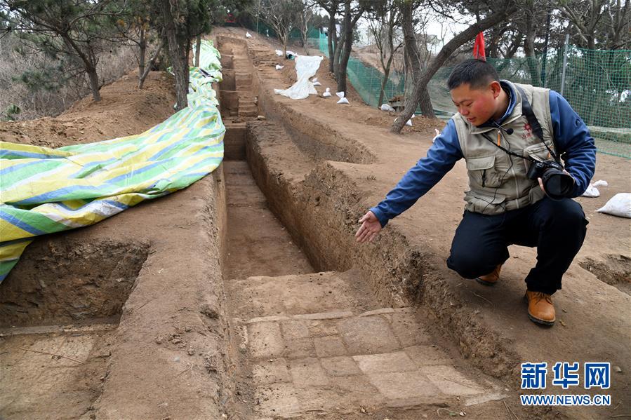 考古隊(duì)員在瑯琊臺(tái)遺址考古發(fā)掘現(xiàn)場介紹發(fā)掘出的秦漢時(shí)期的石砌道路(12月21日攝)。新華社記者李紫恒攝