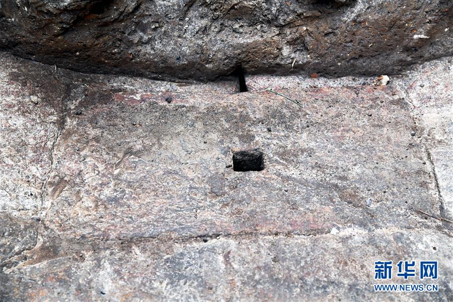 在瑯琊臺(tái)遺址考古發(fā)掘現(xiàn)場拍攝的秦漢時(shí)期的石砌地漏,六方大小石塊斜面壘砌,中間的石塊開有方形小孔。根據(jù)地漏的形狀和制作的精細(xì)程度,可以初步判斷它應(yīng)該用于室內(nèi)排水(12月21日攝)。新華社記者李紫恒攝