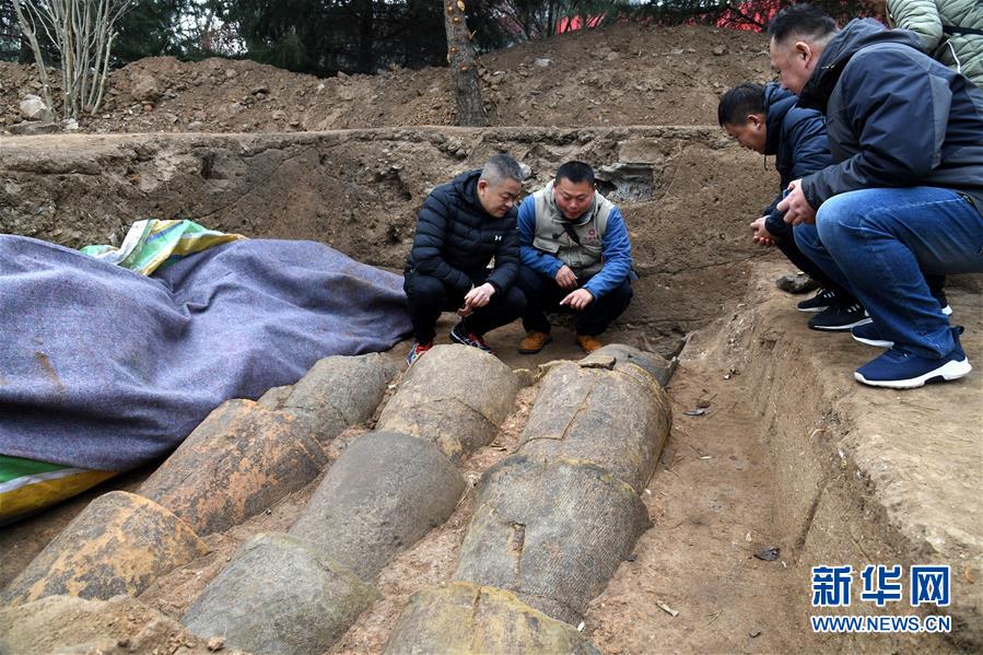 瑯琊臺(tái)遺址考古發(fā)掘現(xiàn)場的陶制管道(12月21日攝)。新華社記者李紫恒攝