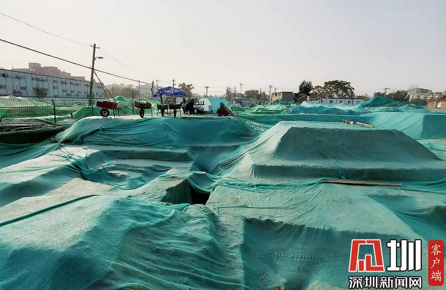 圍擋內(nèi),工地大部分被綠色苫布覆蓋,只露出幾處規(guī)整的探坑。考古工作者正在緊張忙碌中,有些工作人員戴著草帽,坐在馬扎上記錄發(fā)掘細(xì)節(jié),還有一些穿著藍(lán)色背心的工作人員使用工具正在做清理工作。