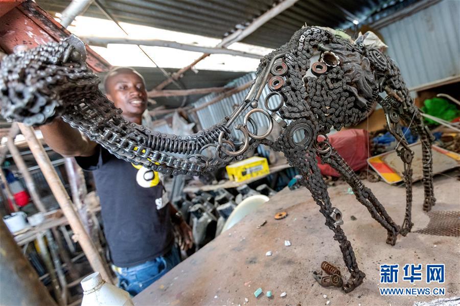 12月20日,在肯尼亞內(nèi)羅畢庫奧納藝術(shù)中心,一名藝術(shù)家展示裝置藝術(shù)作品。成立于1995年的庫奧納藝術(shù)中心位于肯尼亞首都內(nèi)羅畢市區(qū),目前有17間雕塑、繪畫等藝術(shù)工作室。中心不定期舉辦藝術(shù)展覽活動,園區(qū)內(nèi)陳列有各類涂鴉墻及裝置藝術(shù)作品。 新華社記者 王騰 攝