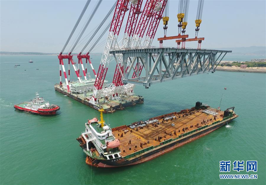 5月12日,“大橋海鷗號”起重船在吊裝一孔簡支鋼桁梁(無人機(jī)拍攝)。新華社記者林善傳攝