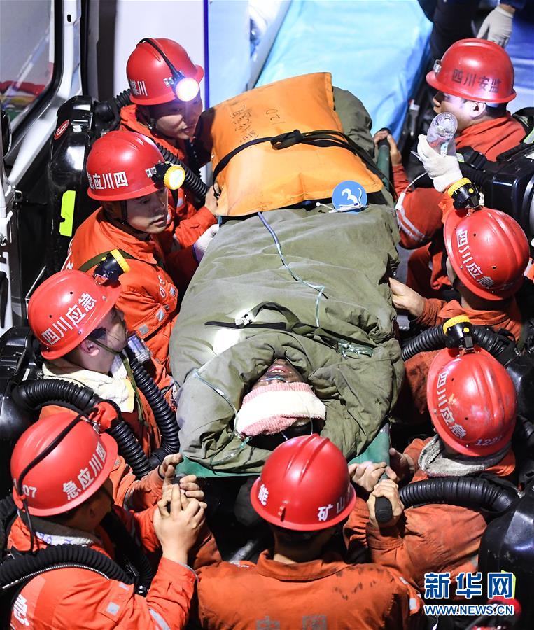 12月18日,救援人員轉(zhuǎn)運(yùn)安全升井的被困人員。 當(dāng)日7時(shí)56分,經(jīng)過(guò)80多個(gè)小時(shí)的緊張救援,發(fā)生透水事故的川煤集團(tuán)杉木樹(shù)煤礦13名被困人員全部安全升井。 新華社記者 薛玉斌 攝