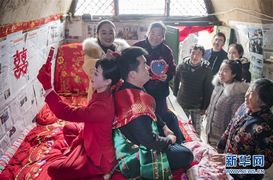 12月18日,在志丹縣金丁鎮(zhèn)謝灣村舉行的一場(chǎng)陜北婚俗表演中,鄉(xiāng)親們?yōu)椤靶氯恕笔崂怼_@是婚俗中的“并頭”環(huán)節(jié)。