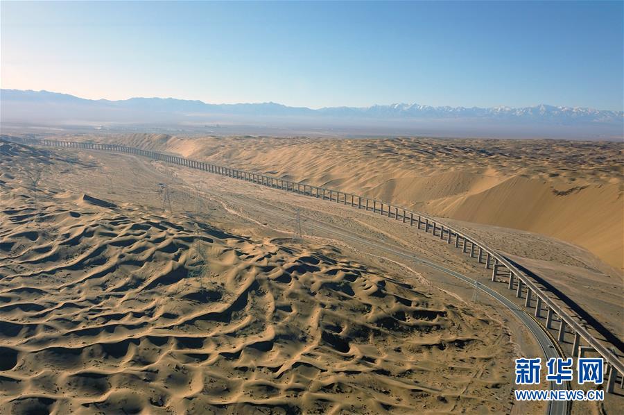 這是敦格鐵路沙山溝特大橋(12月11日無(wú)人機(jī)拍攝)。 敦(煌)格(爾木)鐵路沙山溝特大橋位于甘肅省酒泉市阿克塞哈薩克族自治縣境內(nèi)的庫(kù)姆塔格沙漠內(nèi),是一座穿越活動(dòng)性沙漠地區(qū)的特長(zhǎng)橋梁,也是敦格鐵路的重難點(diǎn)控制工程。據(jù)介紹,橋梁所在區(qū)域風(fēng)沙活動(dòng)頻繁,四季及晝夜溫差大,在建設(shè)過(guò)程中,中鐵十一局集團(tuán)有限公司的建設(shè)者根據(jù)沙層的厚度、分布及含水率的不同,總結(jié)出一套沙丘樁基施工工藝。 新華社記者 范培珅 攝