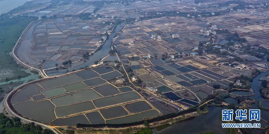 12月21日無人機(jī)拍攝的廣西合浦縣黨江鎮(zhèn)更螺圍出海口的蝦塘。冬日,廣西廉州灣海域風(fēng)光別致。新華社記者張愛林?jǐn)z