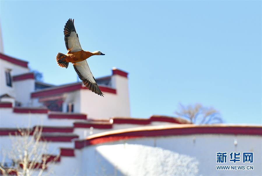 一只赤麻鴨從布達拉宮旁飛過(12月20日攝)。新華社記者張汝鋒攝