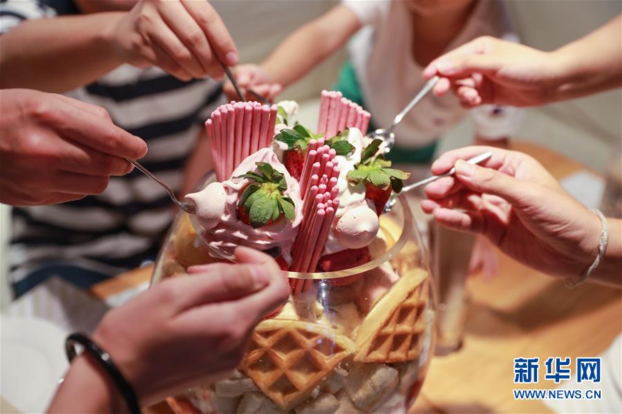 2019年7月28日,在泰國(guó)曼谷,顧客在一家冰淇淋店分享冰淇淋。這家冰淇淋店因?yàn)槠涑罂畹谋苛茏呒t網(wǎng)絡(luò),吸引許多游客前去拍照打卡。 新華社記者 張可任 攝