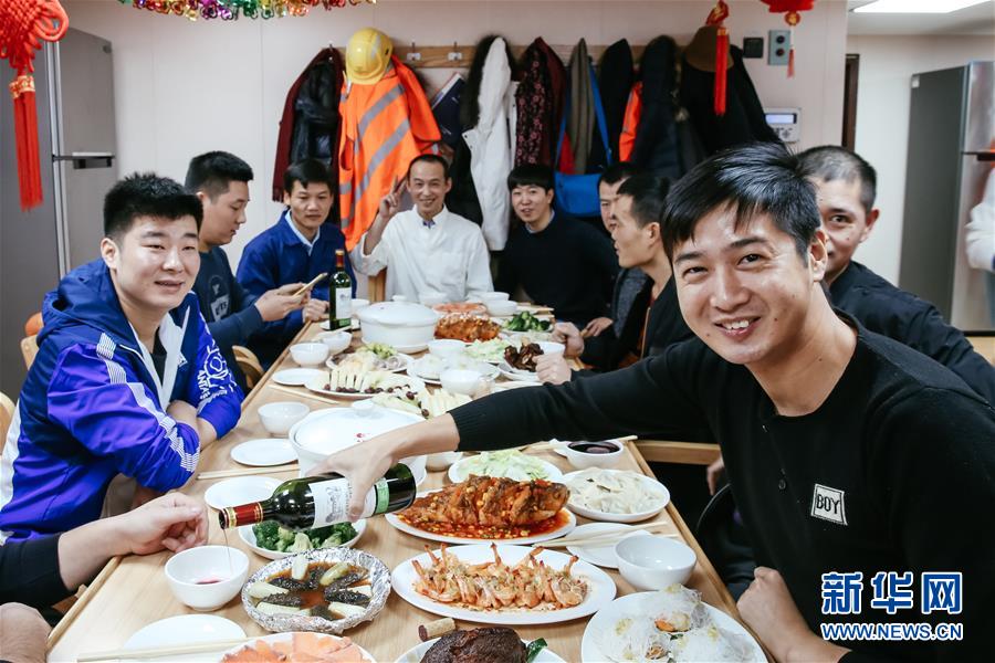 2019年2月5日,在比利時安特衛(wèi)普港,船員們在“中遠海運天秤座”號餐廳里共享遲來的年夜飯。由于駛離漢堡港的時間出現延誤,超大型集裝箱船“中遠海運天秤座”號在2月5日農歷正月初一凌晨兩點才抵達安特衛(wèi)普港,遠洋海員們終于可以開懷暢飲,歡喜過年。 新華社記者 張鋮 攝