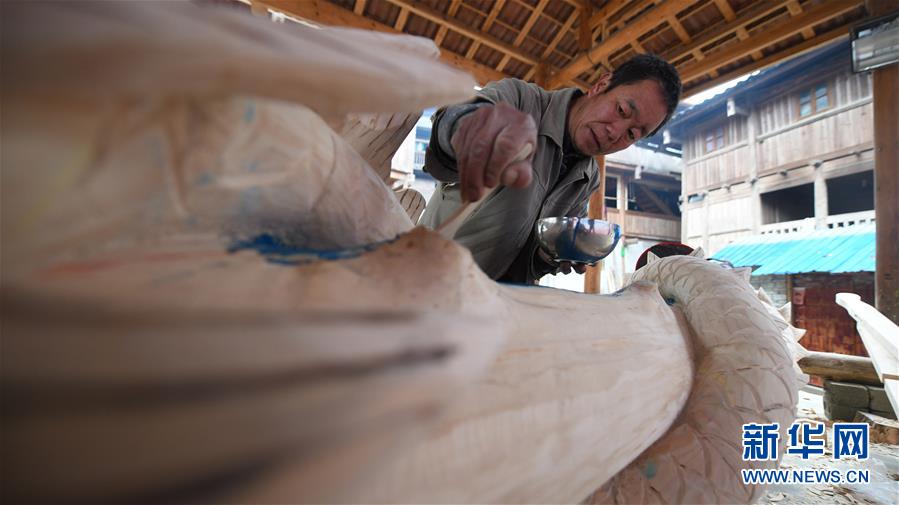 烏英苗寨村民梁秀金給新蘆笙柱涂油漆(12月20日攝)。新華社記者黃孝邦攝