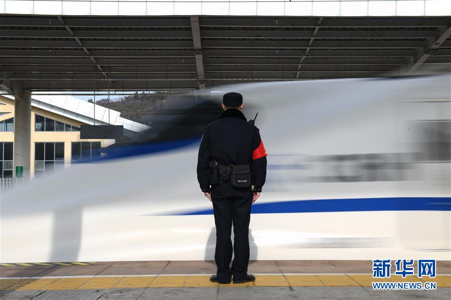 金寨火車站派出所民警張嗣一在站臺接車(12月19日攝)。安徽合肥鐵路公安處金寨火車站派出所位于大別山腹地。在這里,除了所領(lǐng)導(dǎo)外,青年民警平均年齡不到29歲。他們遠(yuǎn)離家鄉(xiāng),扎根大山深處的小站派出所,戰(zhàn)斗在守護客運平安的第一線。新華社記者張端攝