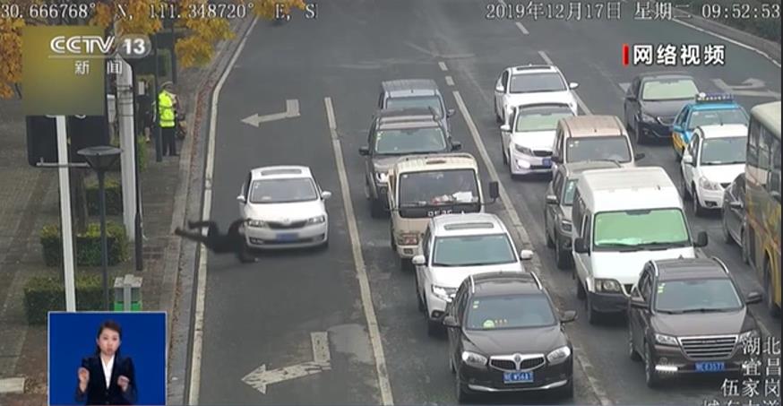 大概10分鐘左右,一名男子小跑著橫穿機(jī)動(dòng)車(chē)道,在高某被撞的同一地點(diǎn),也被一輛白色小車(chē)給撞倒。而這名男子正是高某的丈夫。