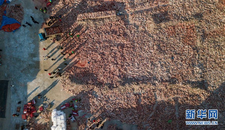 12月27日,在吉林松原查干湖漁場,工人們將魚裝箱(無人機拍攝)。新華社記者張楠攝