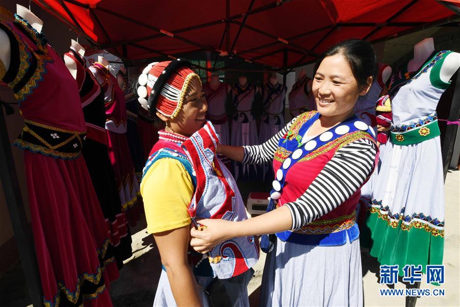 11月2日,云南福貢縣鹿馬登鄉(xiāng)干布村的傈僳族婦女阿白(右)在展示自己手工制作的服飾。阿白靠傳統(tǒng)服飾制作每年可收入三萬多元。新華社記者楊宗友攝