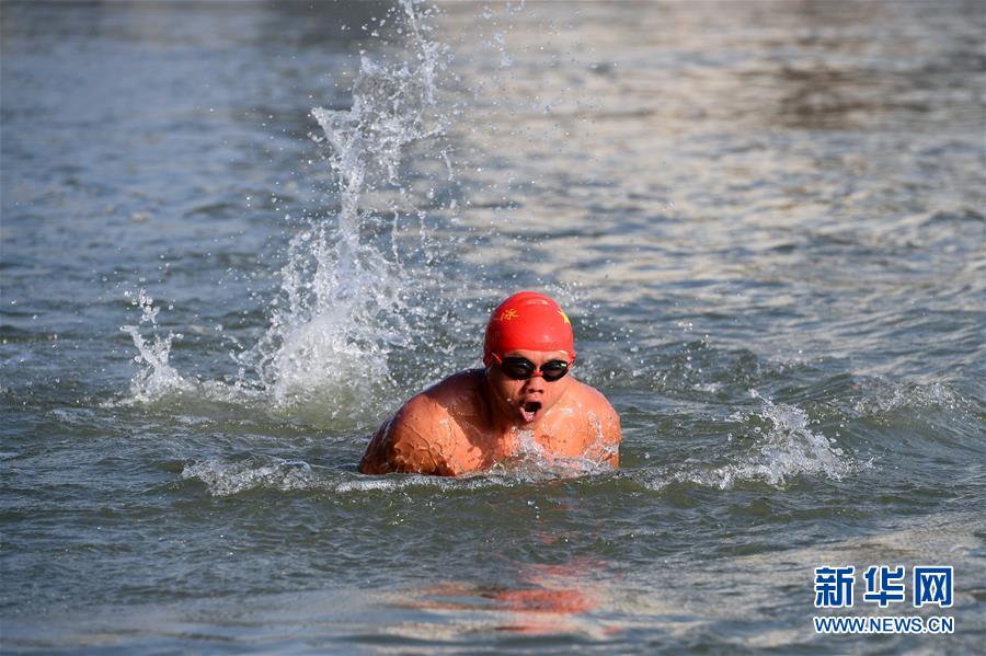 12月18日,冬泳愛(ài)好者李勇在上岸前向身上潑水。新華社記者陳斌攝
