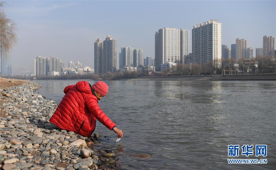 12月19日,在蘭州市馬拉松文化主題公園附近的黃河岸邊,冬泳愛(ài)好者入水準(zhǔn)備冬泳。新華社記者馬寧攝