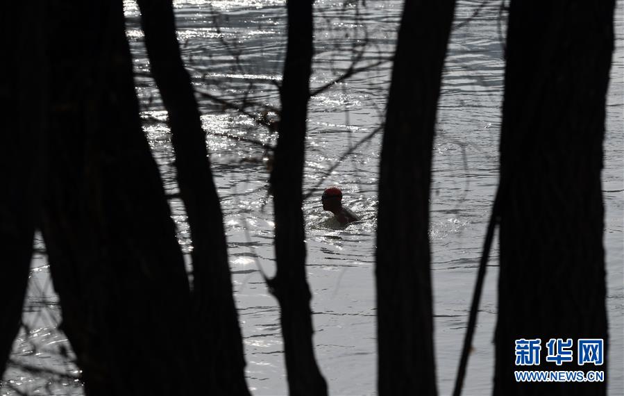 12月18日,冬泳愛(ài)好者張敏捷在黃河冬泳。新華社記者馬寧攝