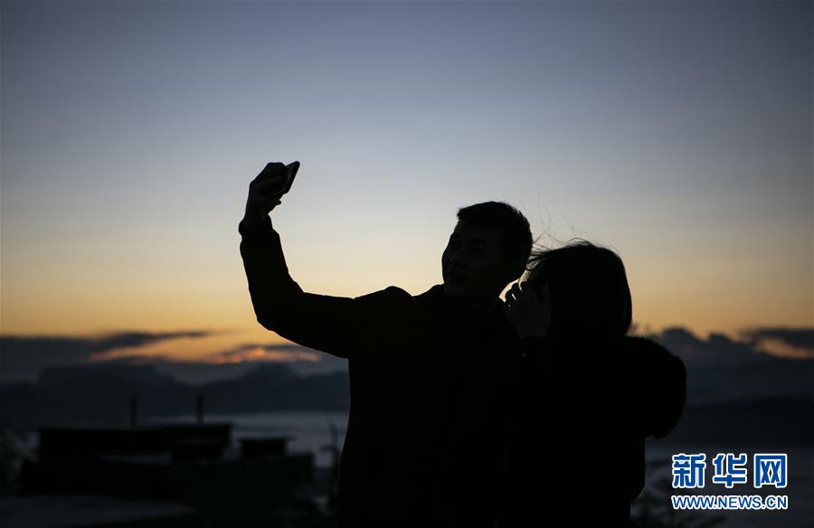 12月28日,在峨眉山金頂,一對(duì)情侶在落日余暉中拍照。時(shí)值冬日,峨眉山銀裝素裹、宛如仙境。新華社記者李夢(mèng)馨攝