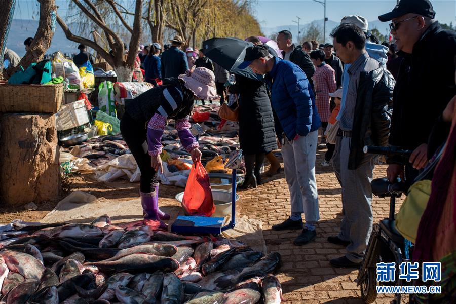 12月25日,在星云湖畔的老河咀魚市,漁民將捕撈到的魚搬運(yùn)上岸。新華社記者胡超攝